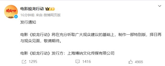 2月14日,春节档电影《蛟龙行动》发布公告,将在充分听取广大观众建议的基础上,制作一部特别版,择日再与观众见面。